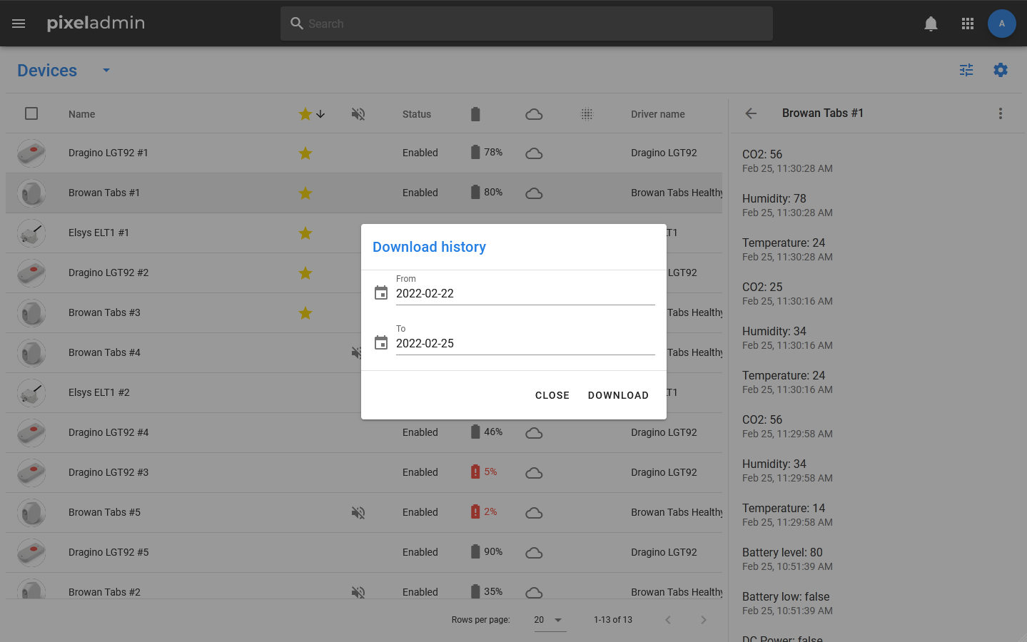 The history is displayed in a special window. In its menu, you can select the period for which the history should be displayed (day, week, month). If you need to get a history for a certain period, you can save it in CSV format.