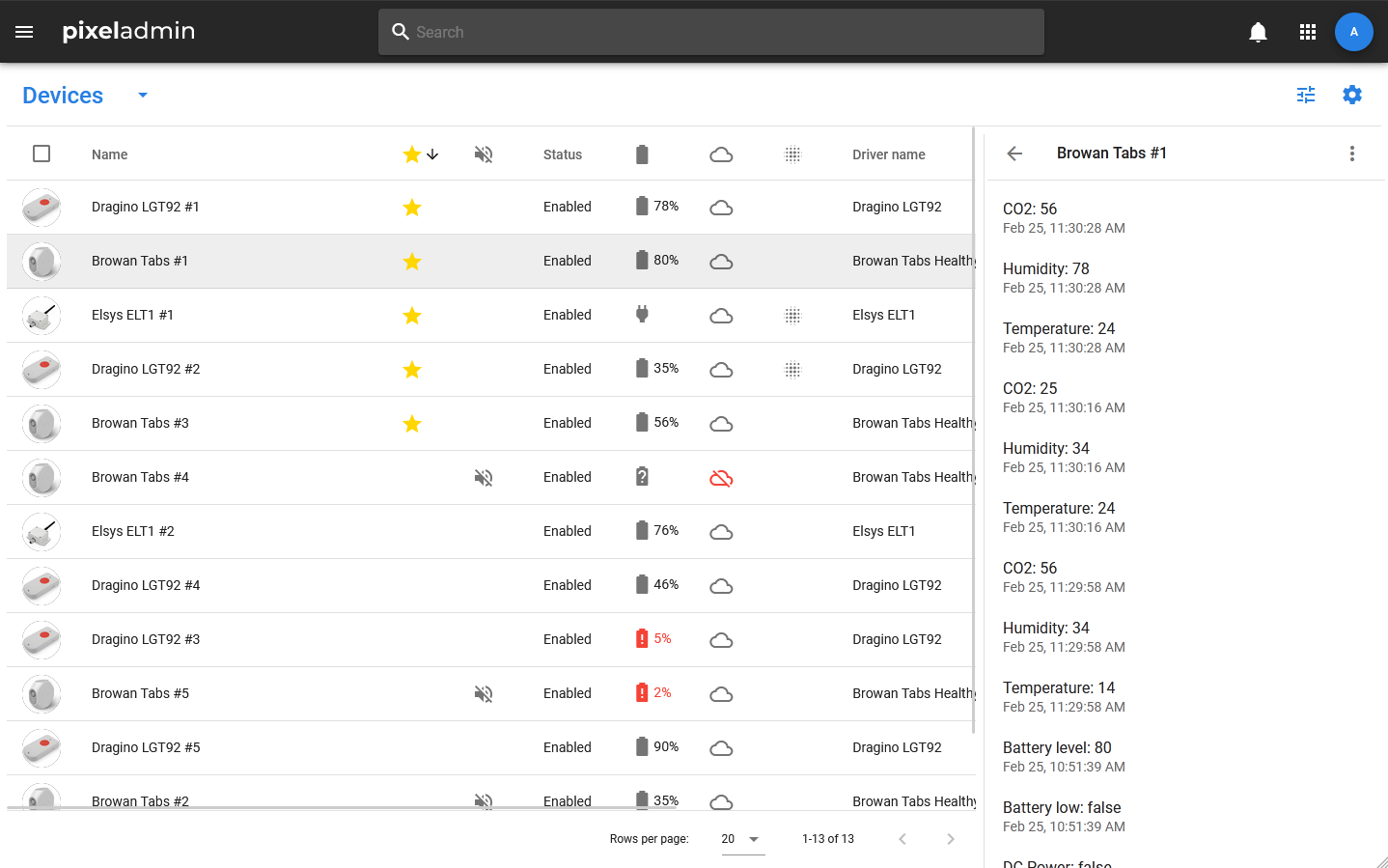 Detailed information about the device is displayed in the card. The status, information about the battery, emulation, and the presence of installed but not applied pending values is included in the subtitle: the status is displayed in text, and icons are used for the rest of the data.